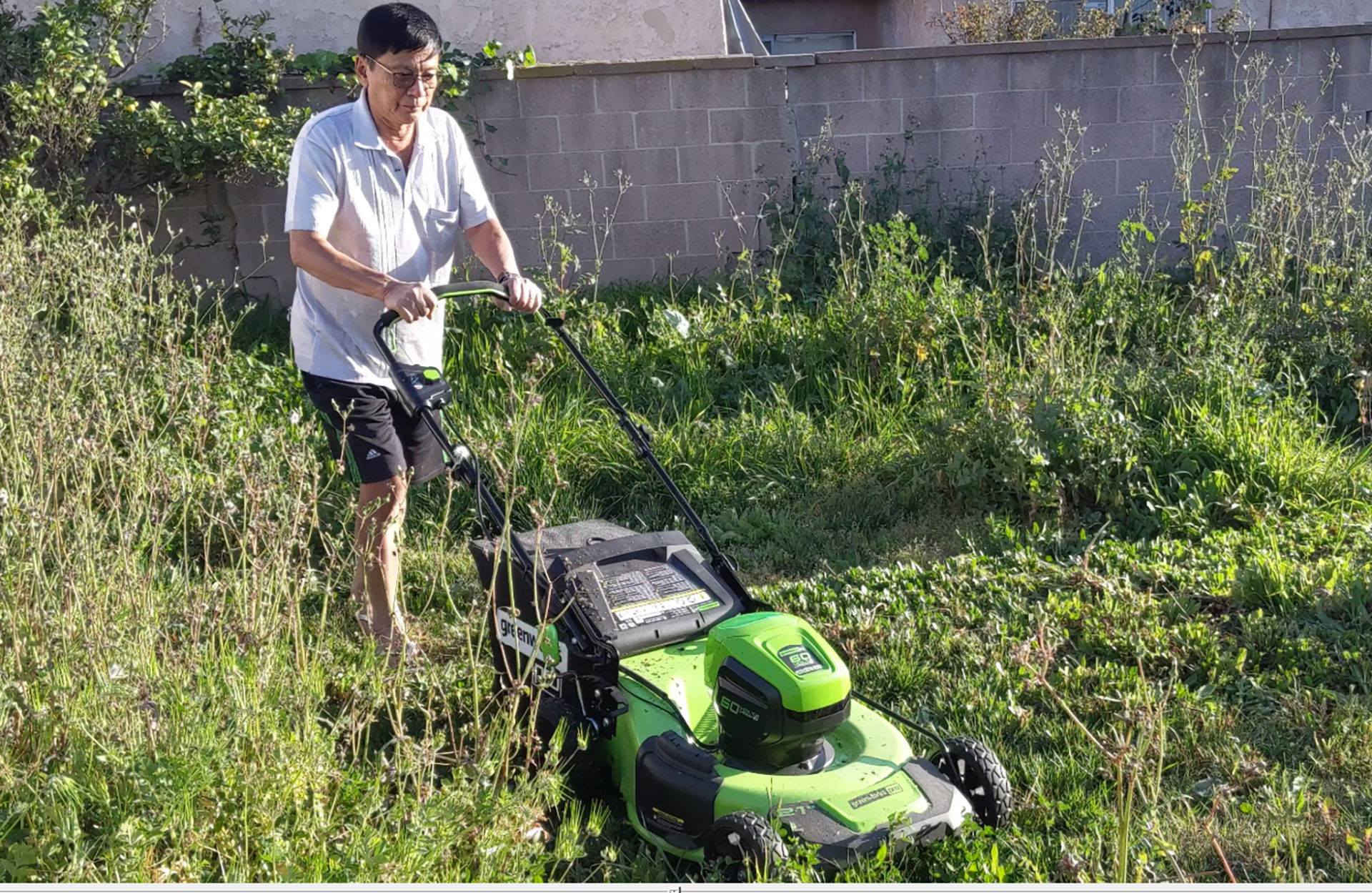 Nhà văn Võ Đắc Danh cắt cỏ cho vợ trồng rau. (Hình: Anh Kiệt)