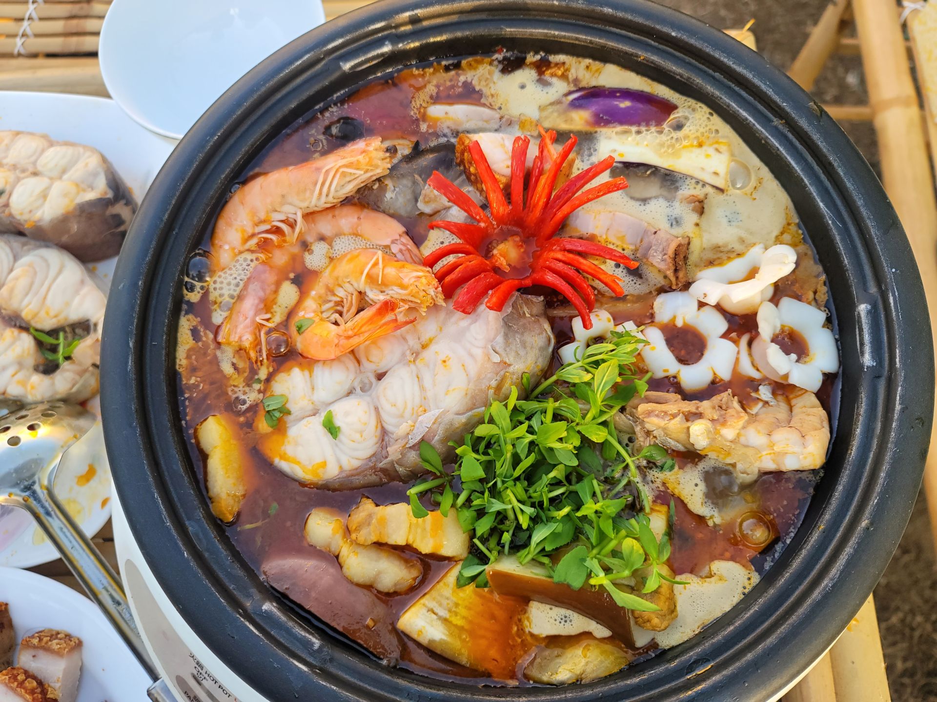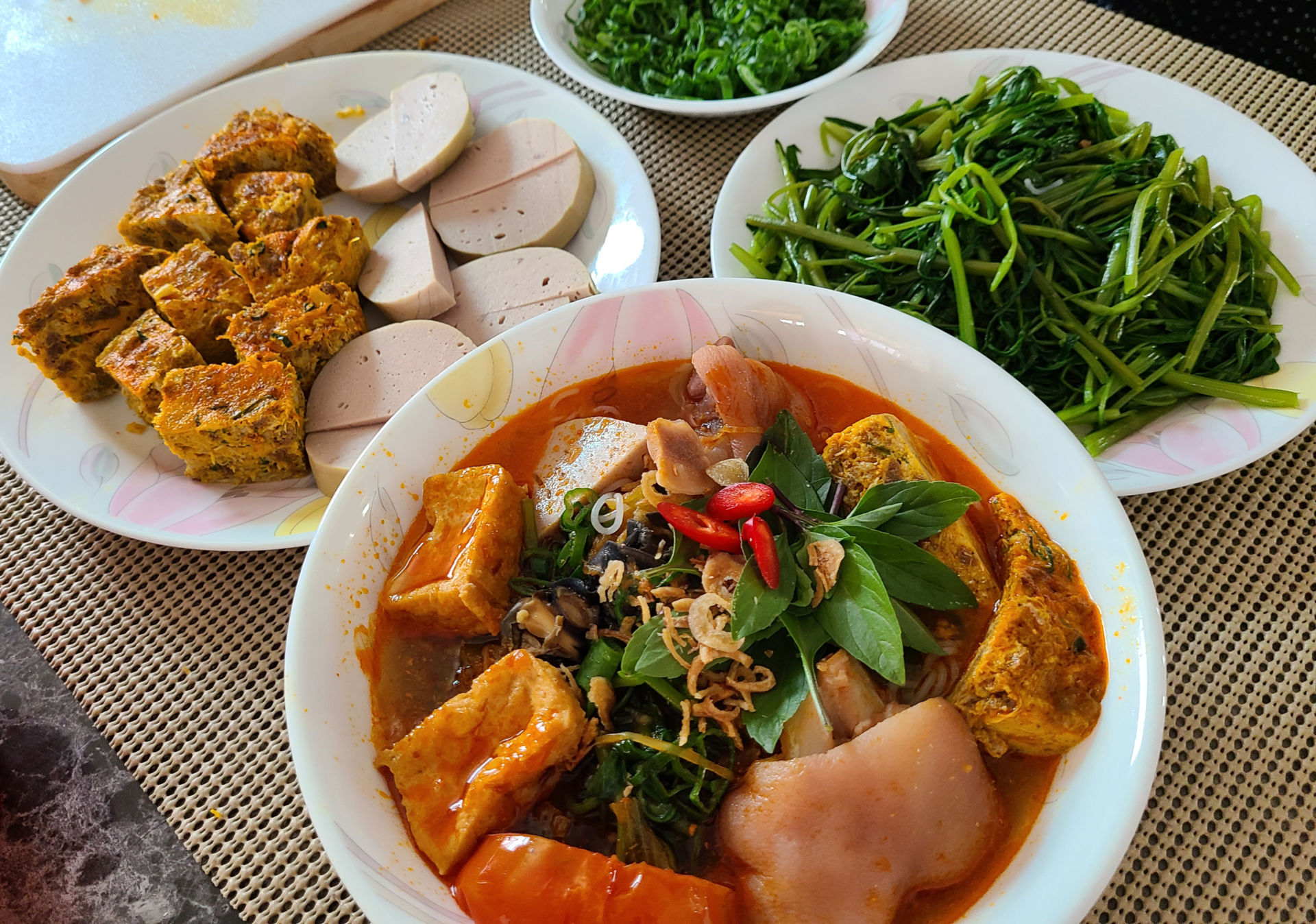 Một tô bún riêu nấu với giò heo, chả cua, có đủ rau xanh chỉ tốn $1. Tô canh chua cơm mẻ bạc hà có đủ loại rau thơm chỉ phải mua thêm cá. Tương tự nồi canh tập tàng sáu thứ rau toàn là thảo dược nấu với tôm khô từ bên nhà mang sang chẳng phải tốn đồng nào. Đặc biệt nhất là món chả mắm lóc trộn đu đủ riềng sả, Lão Nông mới nếm một miếng đã thèm rượu đế.